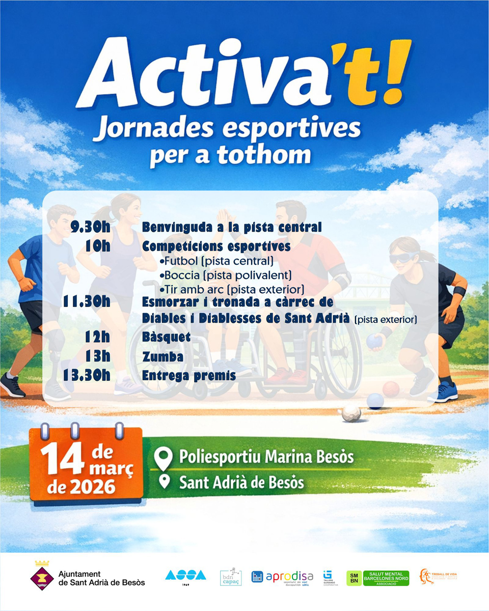 L’esdeveniment, que aplegarà uns 250 participants, té com a objectiu visibilitzar la diversitat funcional, trencar barreres socials i fomentar la convivència mitjançant un programa d’activitats esportives i lúdiques que es desenvoluparà durant el matí de 9.30 a 13.30 h. Hi haurà competicions de futbol, boccia i tir amb arc, partits de bàsquet i una sessió col·lectiva de zumba. A les 11.30 h hi haurà una pausa amb una actuació dels Diables i Diablesses de Sant Adrià. A les 13.30 es farà el lliurament de premis