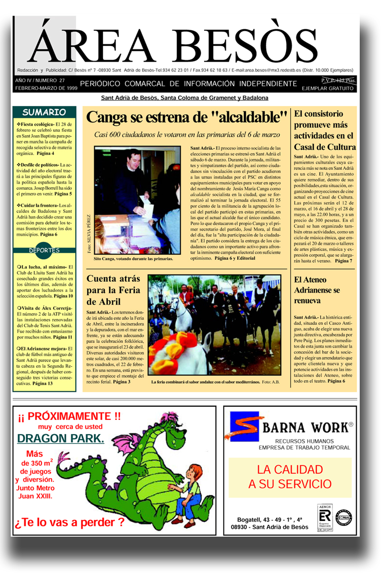InicioHemeroteca (25 Anys) Hemeroteca (25 Anys) Àrea Besòs 27 Febrer 1999 Montse Sáez 24 de enero de 2020 FacebookTwitter AB0027 Cuota FacebookTwitter Artículo anteriorÀrea Besòs 26 Gener 1999Artículo siguienteÀrea Besòs 28 Març 1999 Montse Sáezhttp://www.areabesos.com/diario Últims Articles Comarca Nova edició del CINC, el Cicle de Cinema Infantil en Català, a l’Ocine del Màgic Badalona Actualitat L’ Ajuntament de Sant Adrià de Besòs i el Col·legi Sant Gabriel col·laboren amb l’organització Abre sus Ojos Actualitat Els Mossos d’Esquadra detenen l’autor del robatori d’una bicicleta elèctrica i la retornen al seu propietari a Sant Adrià de Besòs DEJA UNA RESPUESTA Cancelar respuesta Comentario: Por favor ingrese su comentario! Nombre:* Por favor ingrese su nombre aquí Correo electrónico:* ¡Has introducido una dirección de correo electrónico incorrecta! Por favor ingrese su dirección de correo electrónico aquí Sitio web: Guardar mi nombre, correo electrónico y sitio web en este navegador la próxima vez que comente. Δ 3,391FansMe gusta1,640SeguidoresSeguir0SuscriptoresSuscribirte Publicitat Últims Articles Comarca Nova edició del CINC, el Cicle de Cinema Infantil en Català, a l’Ocine del Màgic Badalona Actualitat L’ Ajuntament de Sant Adrià de Besòs i el Col·legi Sant Gabriel col·laboren amb l’organització Abre sus Ojos Actualitat Els Mossos d’Esquadra detenen l’autor del robatori d’una bicicleta elèctrica i la retornen al seu propietari a Sant Adrià de Besòs Actualitat Mor un home mentre treballava en una empresa de Sant Adrià Opinió Chínchate Ayuso: la Flotilla está triunfando Cargar más