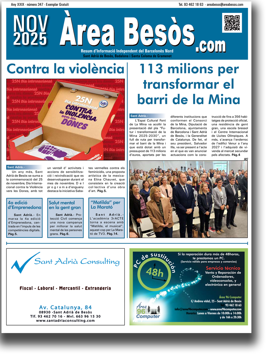En el número de novembre 2025 de l’Àrea Besòs destaquem el nou pla de futur pel barri de la Mina, amb l’acançament de l’enderroc del bloc Venus pel 2027, així com la programació del 25N, Dia contra la Violència vers les Dones.