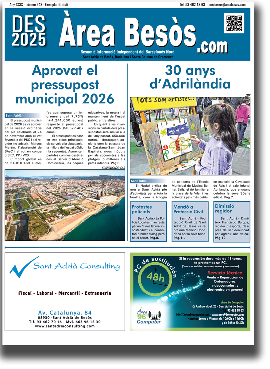 AB0348En el número de desembre de l’Àrea Besòs destaquem l’aprovació del pressupost pel proper any, així com les activitats de Nadal, especialment la 30ena edició del saló infantil i juvenil Adrilàndia.