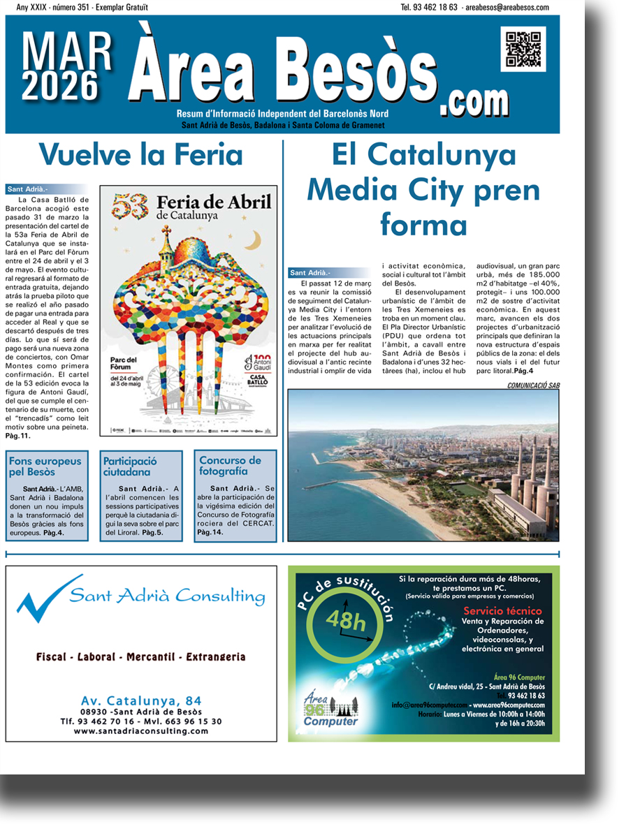 En el número de març de l’Àrea Besòs destaquem els nous passos cap al Media City de les tres xemeneies i la nova edició de la Feria de Abril que es durà a terme al Parc del Fòrum del 24 d’abril al 3 de maig.