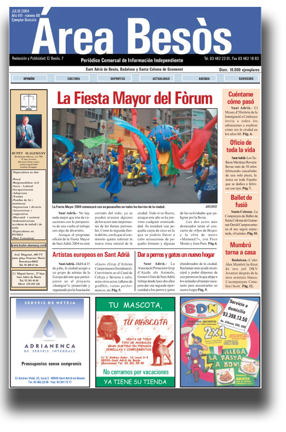 InicioHemeroteca (25 Anys) Hemeroteca (25 Anys) Àrea Besòs 88 Juliol 2004 Montse Sáez 11 de marzo de 2020 FacebookTwitter AB0088 Cuota FacebookTwitter Artículo anteriorÀrea Besòs 87 Juliol Especial Fòrum 2004Artículo siguienteÀrea Besòs 89 Especial Festa Major 2004 Montse Sáezhttp://www.areabesos.com/diario Últims Articles Actualitat Els Mossos d’Esquadra detenen una dona a Sant Adrià de Besòs per vendre maquinària sostreta a través d’un portal d’internet de compravenda d’objectes de... Actualitat Sant Adrià participa en la 8a Acció Platges Met de sensibilització ciutadana sobre els valors dels ecosistemes litorals metropolitans Actualitat Protecció Civil de Sant Adrià celebra el Dia Mundial de la Reanimació Cardiopulmonar amb activitats a la plaça de la Vila DEJA UNA RESPUESTA Cancelar respuesta Comentario: Por favor ingrese su comentario! Nombre:* Por favor ingrese su nombre aquí Correo electrónico:* ¡Has introducido una dirección de correo electrónico incorrecta! Por favor ingrese su dirección de correo electrónico aquí Sitio web: Guardar mi nombre, correo electrónico y sitio web en este navegador la próxima vez que comente. Δ 3,391FansMe gusta1,640SeguidoresSeguir0SuscriptoresSuscribirte Publicitat Últims Articles Actualitat Els Mossos d’Esquadra detenen una dona a Sant Adrià de Besòs per vendre maquinària sostreta a través d’un portal d’internet de compravenda d’objectes de... Actualitat Sant Adrià participa en la 8a Acció Platges Met de sensibilització ciutadana sobre els valors dels ecosistemes litorals metropolitans Actualitat Protecció Civil de Sant Adrià celebra el Dia Mundial de la Reanimació Cardiopulmonar amb activitats a la plaça de la Vila Cultura El nou cicle de concerts de l’Escola Municipal de Música s’estrena amb «Nit de tangos» Comarca Amb 25 anys d’història, torna a Santa Coloma de Gramenet el Festival Internacional de Teatre Integratiu (FITI), pioner en les arts escèniques inclusives Cargar más
