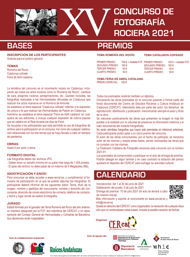 El Centro de Estudios Rocieros y Cultura Andaluza en Catalunya (CERCAT), con sede en Sant Adrià de Besòs, ha hecho públicas las bases de la decimoquinta edición de su Concurso de Fotografía Rociera 2021. Debido a la situación causada por la pandemia de Covid-19 en todo el mundo, la XV edición de nuestro Concurso Fotográfico ha debido adaptarse a las circunstancias. Como en la edición de 2020, este año tampoco se han celebrado ni la Romería del Rocío, ni la Feria de Abril ni las procesiones de Semana Santa, por lo que os animamos de nuevo a que busquéis en vuestros archivos fotográficos y participéis con imágenes de pasadas ediciones.