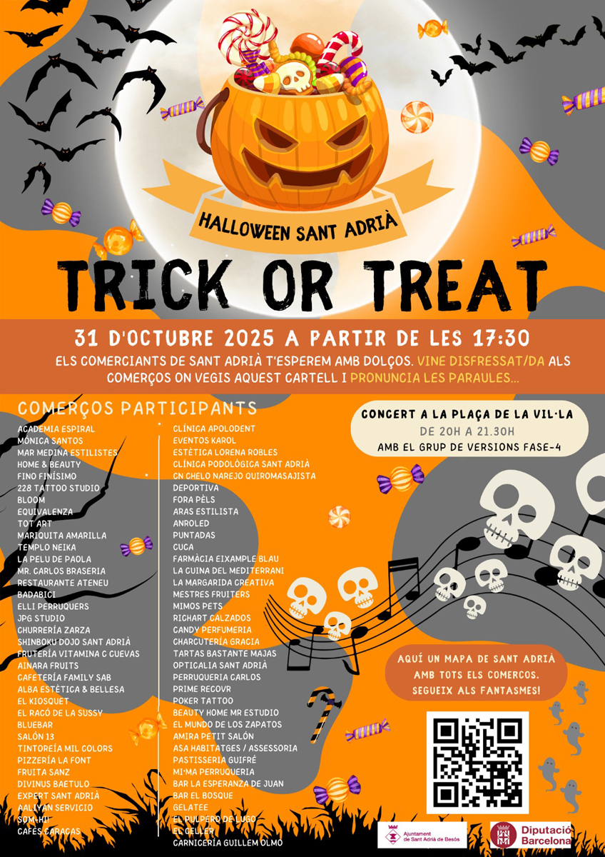 El proper 31 d’octubre a partir de les 17:30h els comerços de Sant Adrià de Besòs organitzen la ruta de Halloween amb repartiment de caramels i amb la col·laboració de l’Ajuntament. Només cal que vagis disfressat, visitis els comerços de la ruta que trobaràs a través del codi qr i diguis la frase…