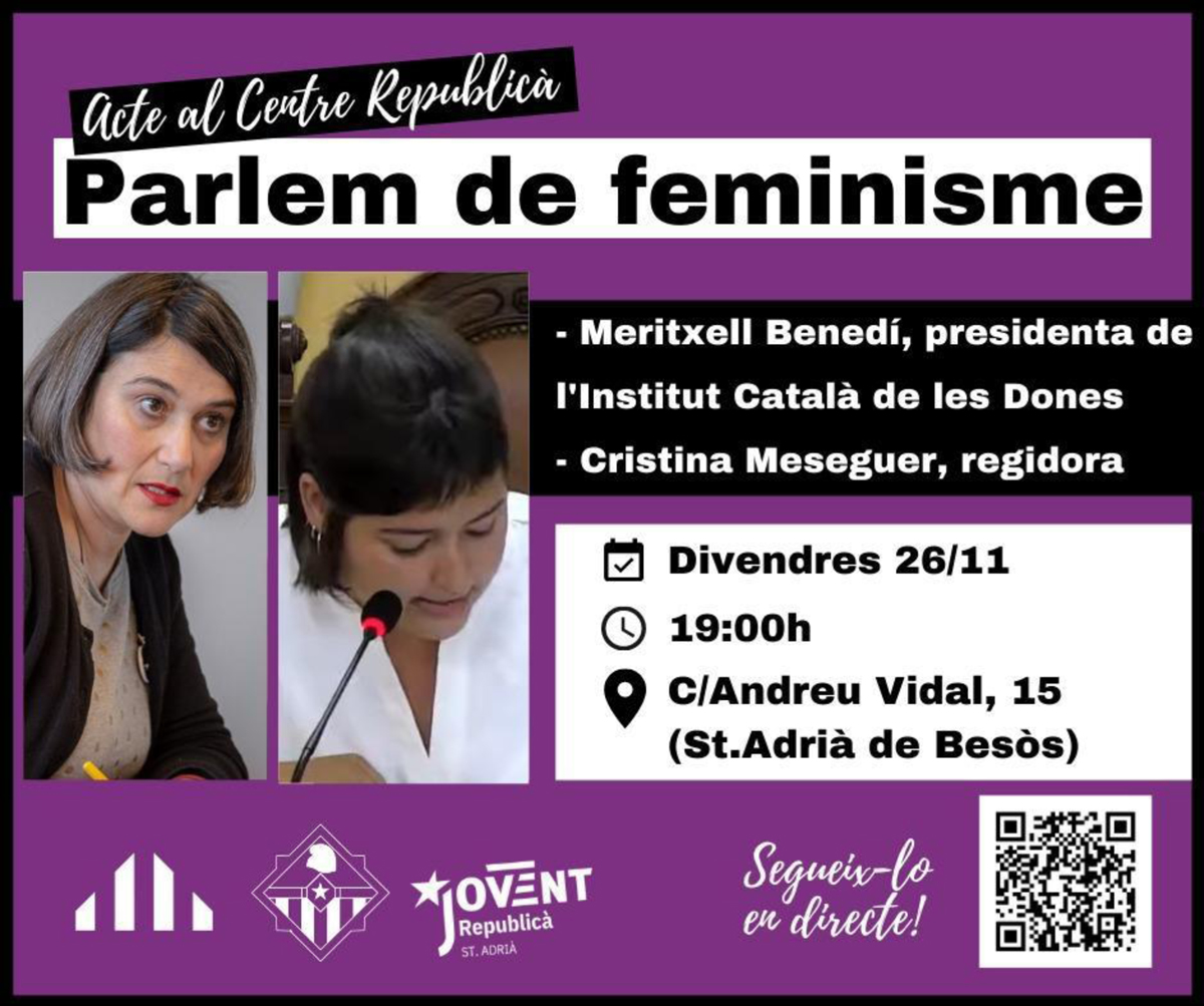 La primera d’aquestes xerrades es durà a terme aquest 26 de novembre, en què es parlarà de feminisme dins del context de la Diada internacional envers les violències masclistes del 25N. En aquesta xerrada intervindran la regidora republicana a l’ajuntament, Cristina Meseguer, i la presidenta de l’Institut Català de les Dones, Meritxell Benedí, les quals abordaran el tema del feminisme tant des l’òptica local com nacional.