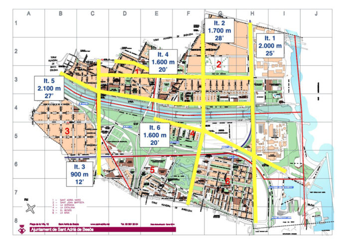 • Av. Joan XXIII – Carrer Santa Caterina – Av. de Catalunya – Av. de la Platja (marge esquerre): 1.600 m – 20 minuts / Av. de Catalunya – Av. de la Platja: 1.600 m – 20 minuts