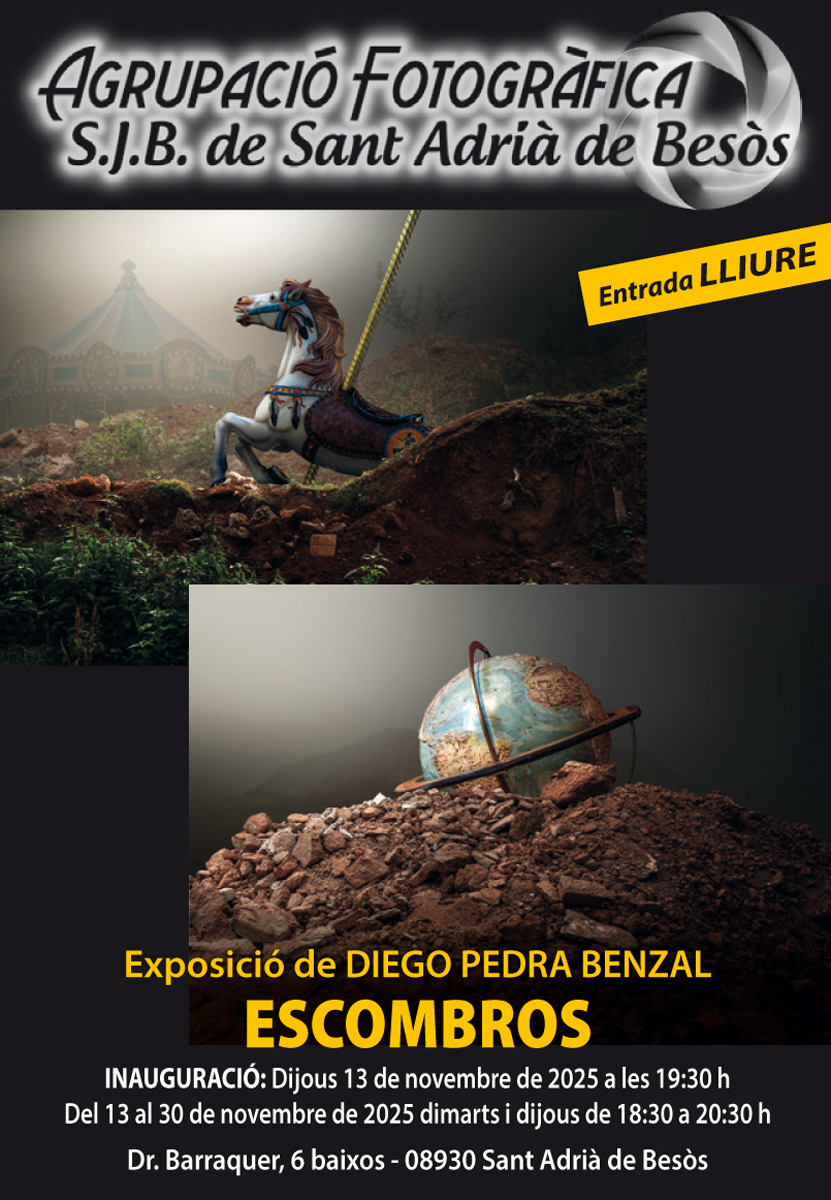 El proper dijous, 13 de novembre, a les 19.30 hores, es durà a terme a la seu de l’Agrupació Fotogràfica Sant Joan Baptista de Sant Adrià (c.Dr. Barraquer, 6) la inauguració de l’exposició fotogràfica «Escombros», del fotògraf Diego Pedra.