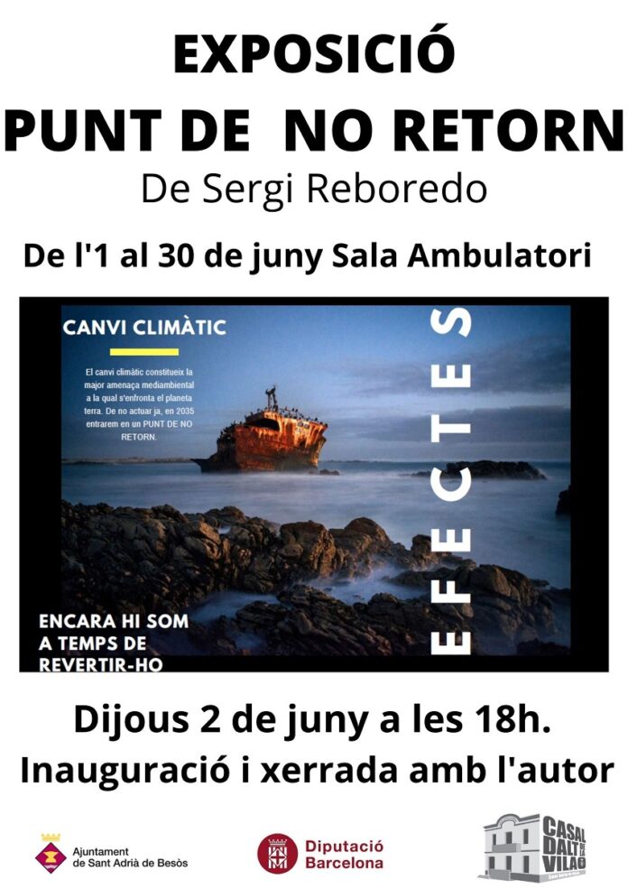 Des d’avui, 1 de juny, i fins el dia 30, es podrà visitar a la Sala Ambulatori del Casal Dalt de la Vila (Plaça de l’Església, 13) l’exposició «Punt de no retorn» del fotoperiodista adrianenc Sergi Reboredo sobre les conseqüències del canvi climàtic.