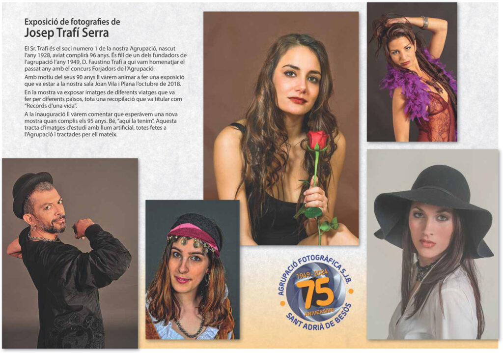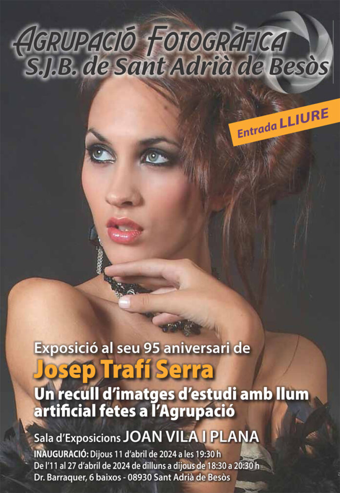 El Josep Trafí Serra és el soci número 1 de l’Agrupació Fotogràfica Sant Adrià. Nascut l’any 1928 i fill d’un dels fundadors de l’agrupació l’any 1949, el Faustino Trafí, inaugura aquest proper dijous una exposició de fotografies d’estudi amb llum artificial fetes a la seu de l’entitat i tractades per ell mateix. El 2018, amb 90 anys, l’agrupació va voler homenatjar-lo amb una mostra en la que va exposar imatges dels seus viatges pel món. Li van comentar que quan fes els 95 anys hauria de fer una altra, i aquí la tenim.