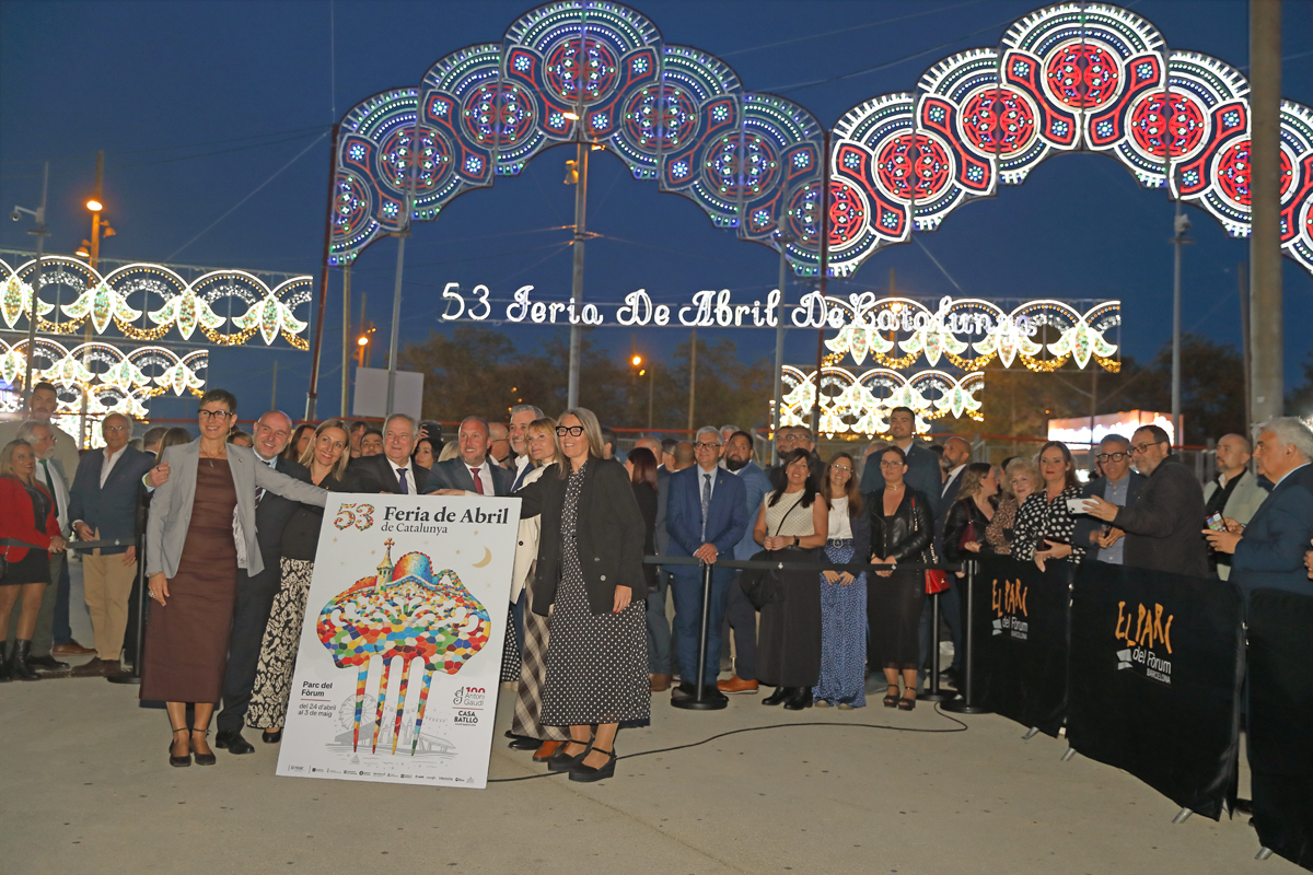 Este viernes, 24 de abril, a las nueve de la noche, la multitud se agrupaba entorno a la portada, aún apagada, de la 53a Feria de Abril de Catalunya en el parc del Fòrum. Esperaban a los políticos, aunque más bien esperaban el encendido que, aunque no tan espectacular como el de Sevilla, siempre tiene ese punto de emoción entre las miles y miles de personas que esperan la Feria como agua de mayo. En esta edición había más tranquilidad, sin protestas de los feriantes por el cobro de la entrada al recinto como el año pasado. Las aguas estaban calmadas y poco a poco fueron llegando las autoridades encargadas del encendido de la portada. Estaban presentes la alcaldesa de Sant Adrià de Besòs, Filo Cañete, el alcalde de Barcelona, Jaume Collboni, el ministro de Industria y Turismo y anterior alcalde de Barcelona, Jordi Hereu, Eva Menor, concellera de Igualdad y Feminismo de la Generalitat de Catalunya, Lluïsa Moret, presidenta de la Diputació de Barcelona, y la delegada de la Junta de Andalucía en Catalunya, Concepción Veray, todos ellos acompañados por Daniel Salinero, presidente de la Federación de Entidades Culturales Andaluzas en Cataluña (FECAC), la organizadora de la Feria de Abril. Finalmente no acudió el president de la Generalitat, Salvador Illa, como estaba anunciado.