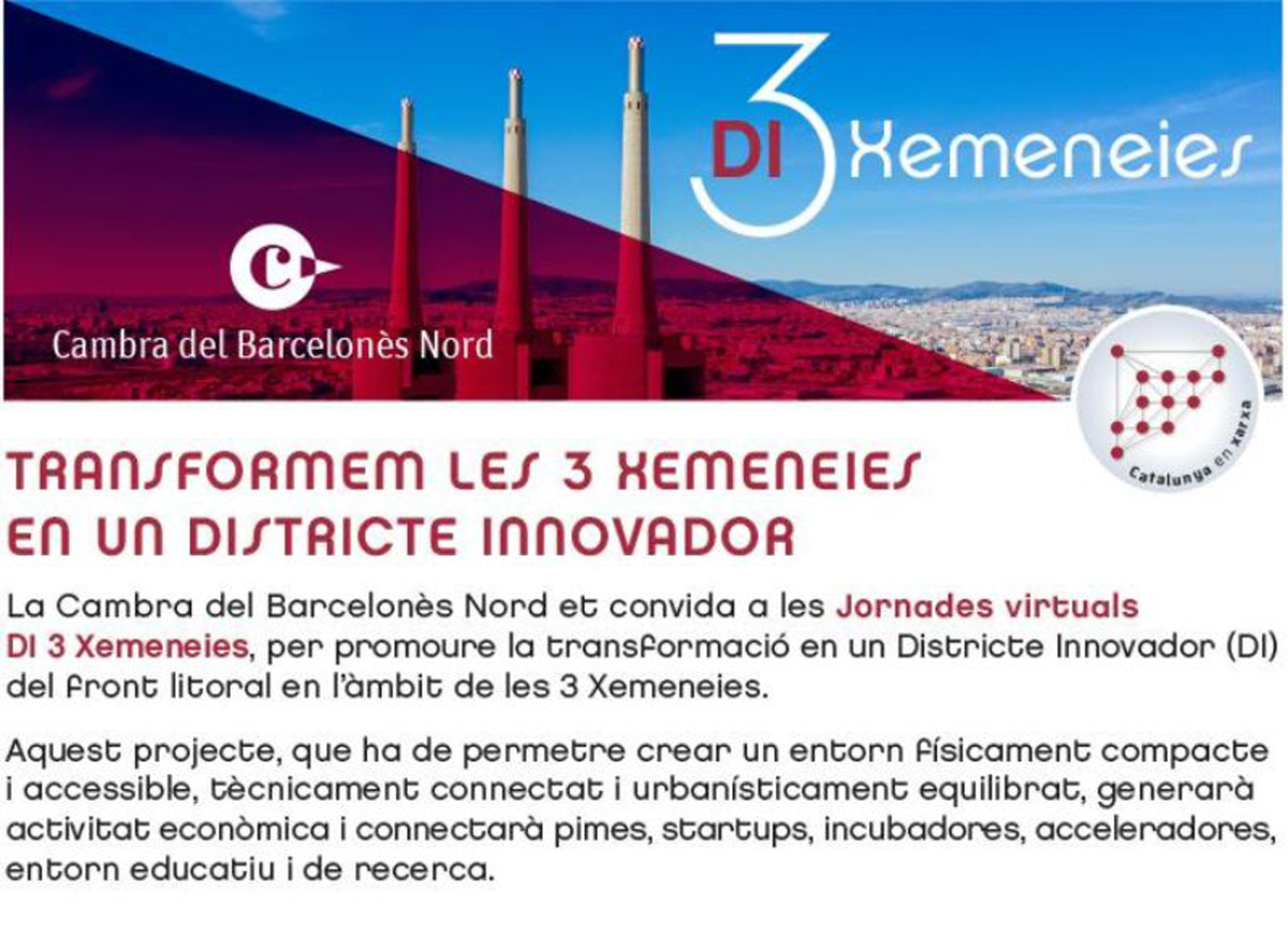 La Cambra del Barcelonès Nord organitza les “Jornades virtuals DI 3 Xemeneies” on s’abordaran les principals transformacions de l’espai del front litoral entre Badalona i Sant Adrià de Besòs, conegut com les Tres Xemeneies, en un Districte Innovador. Les 5 jornades, que tindran lloc en el BCIN i es podran seguir en línia, compten amb el suport de l’Ajuntament de Badalona, Reactivació de Badalona, els ajuntaments de Sant Adrià de Besòs i Santa Coloma de Gramenet i l’associació Restarting Badalona.