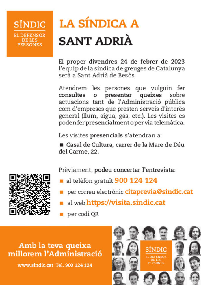 El proper divendres 24 de febrer de 2023 l’equip de la síndica de greuges de Catalunya serà a Sant Adrià de Besòs.