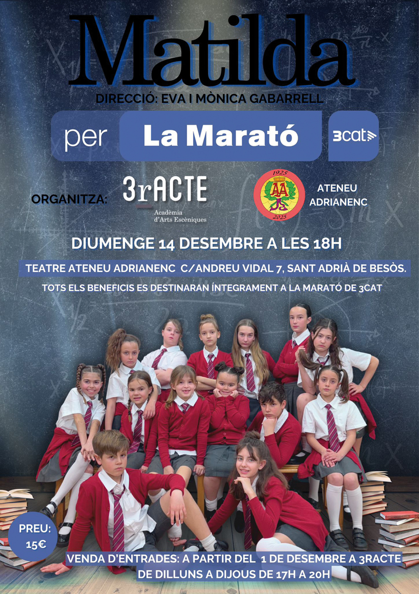 Matilda, el musical es podrà veure el diumenge 14 de desembre a les 18h al Teatre Ateneu Adrianenc. Les entrades (15 €) estaran disponibles a partir de l’1 de desembre a 3rACTE, de dilluns a dijous de 17 h a 20 h. Es tracta d’un espectacle apte per a totes les edats, ideal per gaudir-lo en família mentre es col·labora amb una causa solidària.