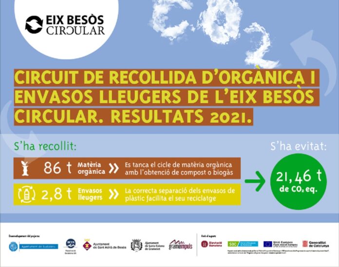 El circuit privat de recollida de matèria orgànica i envasos lleugers de l’Eix Besòs Circular va recuperar més de 86 tones de matèria orgànica i 2,8 tones d’envasos lleugers durant l’any 2021. La recollida selectiva d’aquestes dues fraccions ha permès evitar l’emissió de 21,46 tones de CO2eq que haurien anat a parar a l’atmosfera si aquests residus haguessin estat tractats com a fracció resta.