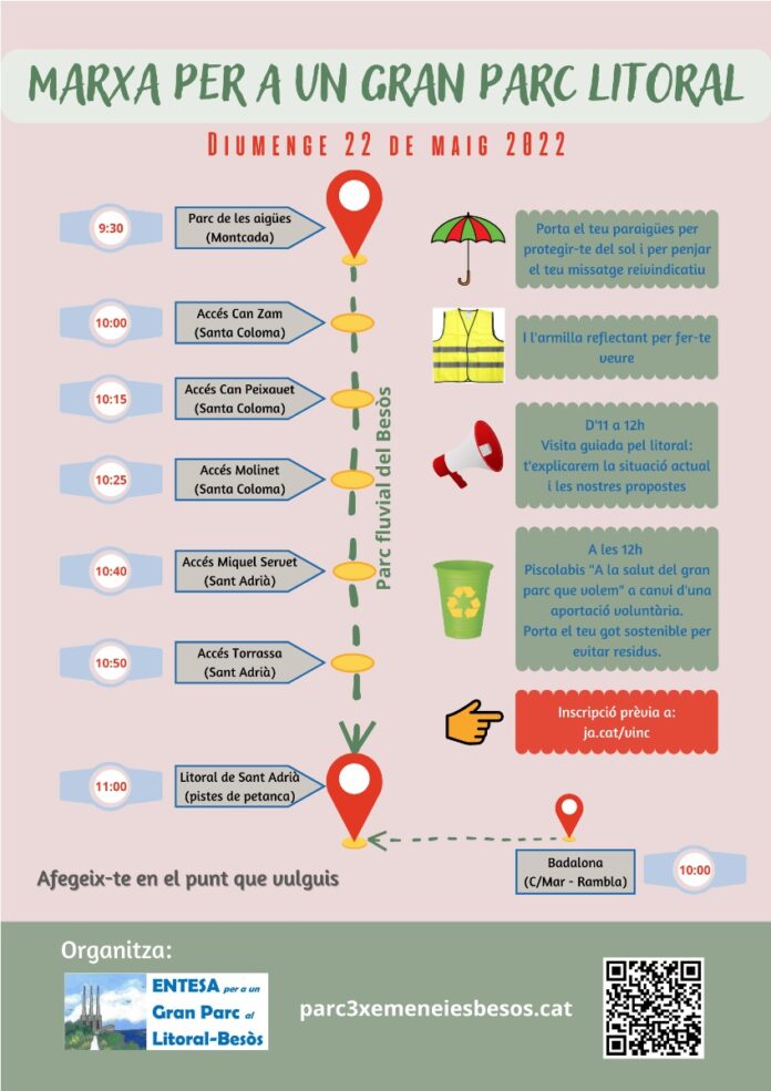 La passejada començarà a les 9.30 h. al Parc de les aigües de Montcada i Reixac. Es travessarà el riu per la passera i s’accedirà al margue esquerra per anar passant pels diferents accissos al parc a Santa Coloma, Barcelona i Sant Adrià, on es podran incorporà els participants. Hi haurà una columna procedent de Badalona que sortirà a les 10 hores de la confluència del carrer del mar amb la Rambla i s’incorporà a les 11 h. al punt d’arribada situat a la pineda propera a la platja de Sant Adrià.