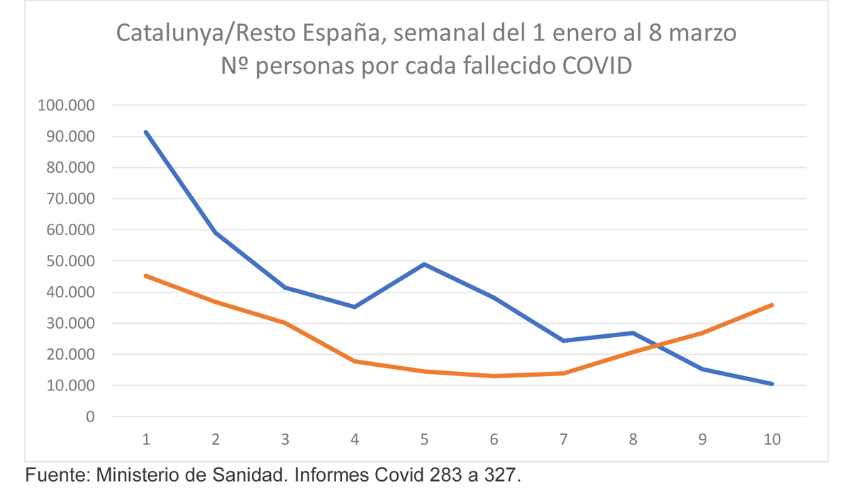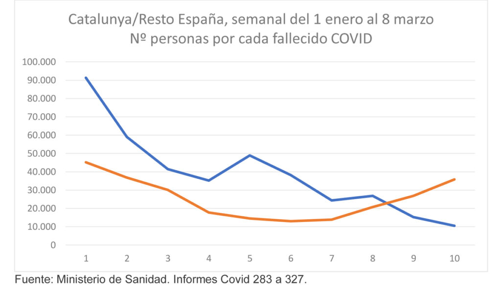 Los diez resultados de cada curva corresponden al número de habitantes por cada fallecido Covid (según las cifras del Ministerio), en relación con las poblaciones respectivas de Catalunya (7.675.217) y España menos Catalunya (39.350.991), para mantener la coherencia de los datos de mortalidad pandémica que se exponen.