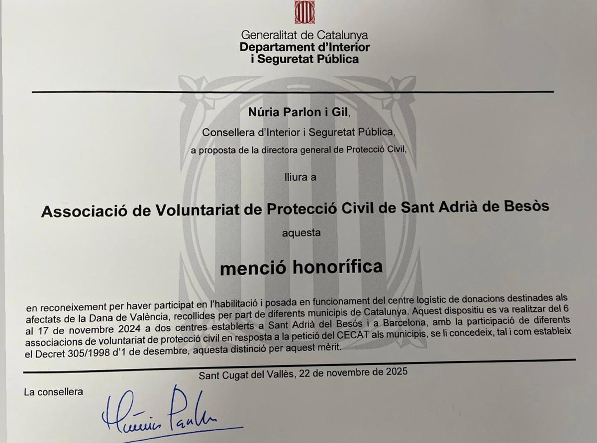 Durante la ceremonia, la Asociación Adrianenca de Voluntarios de Protección Civil de Sant Adrià de Besòs recibió una mención honorífica por su participación en la habilitación y puesta en funcionamiento del centro logístico de donaciones destinado a los afectados por la DANA de Valencia.