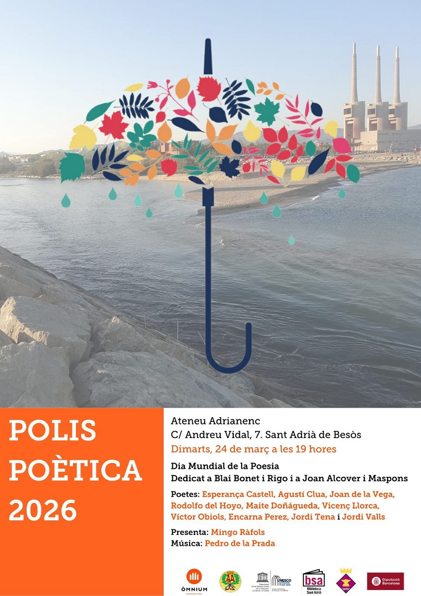Avui dimarts, 24 de març, Òmnium, Unesco Sant Adrià, Ateneu Adrianenc, Biblioteca Sant Adrià, Diputació de Barcelona i el consistori de la ciutat celebren el Dia de la Poesia amb una nova edició de la Polis Poètica. Enguany participaran els i les poetes Esperança Castell, Agustí Clua, Joan de la Vega, Maite Doñágueda, Rodolfo del Hoyo, Vicenç Llorca, Víctor Obiols, Encarna Pérez, Jordi Tena i Jordi Valls.