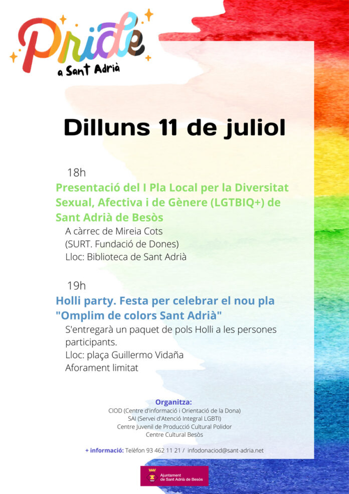 El proper dilluns 11 de juliol es presentarà el Pla local per la diversitat sexual, afectiva i de gènere (LGTBIQ+) de Sant Adrià de Besòs. Serà a les 18 h, a la Biblioteca Sant Adrià, a càrrec de la Mireia Cots, de l’entitat d’acció social SURT. Fundació de Dones que ha elaborat el document i de la Laia Franco, cap de l’Oficina de Polítiques d’Igualtat de la Diputació de Barcelona. Hi assistiran l’alcaldessa de la ciutat, Filo Cañete, i la regidora de Polítiques d’Igualtat, Rosi Villalonga.