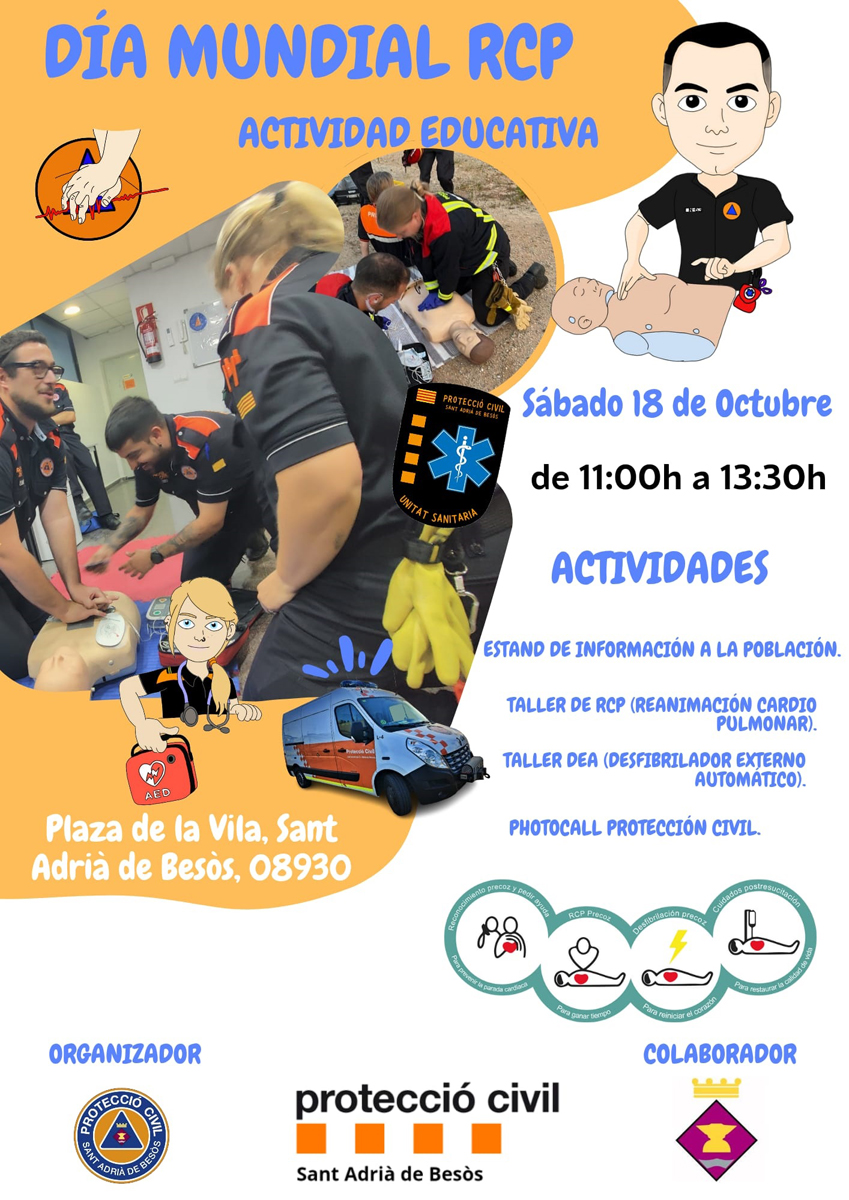 L’Associació Adrianenca de Voluntariat de Protecció Civil celebra demà dissabte, 18 d’octubre a la plaça de la Vila, el Dia Mundial de la Reanimació Cardiopulmonar (RCP) amb diverses activitats que tenen com a objectiu de sensibilitzar la població sobre la importància de la RCP i fomentar l’aprenentatge d’aquesta tècnica essencial per salvar vides. Les activitats estaran dirigides tant a adults com a infants, i inclouran: activitats lúdiques i formatives relacionades amb la protecció civil i la prevenció de situacions d’emergència, tallers pràctics de RCP per a totes les edats i l’exposició de vehicles d’intervenció i emergència.