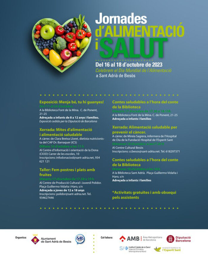 La informació en salut a la població és una de les finalitats de les Jornades de Salut i Alimentació que a més, volen commemorar el dia Mundial de l’Alimentació . Aquestes jornades les organitza l’Ajuntament amb el suport de la Diputació de Barcelona i la participació de l’Institut Català de la Salut, la Fundació de l’Hospital de l’Esperit Sant (FHES) i l’Àrea Metropolitana de Barcelona.