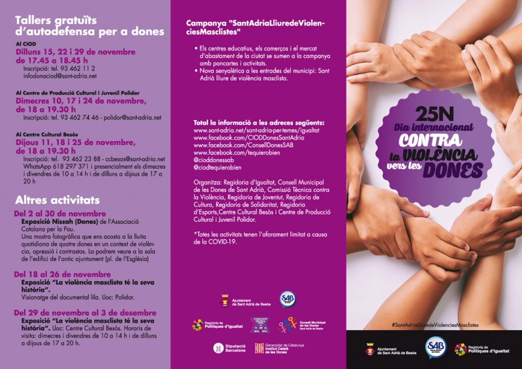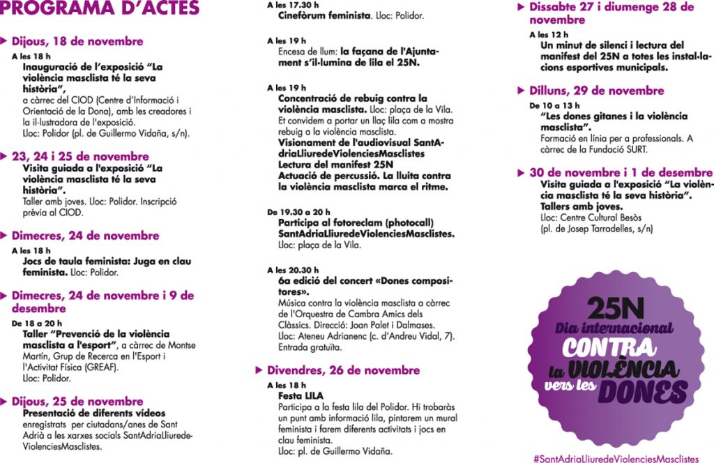 El programa es desenvoluparà durant tot aquest mes i començarà avui 18 de novembre amb la inauguració de l’exposició «La violència masclista té la seva història», realitzada per l’equip del Centre d’Informació i Orientació de la Dona (CIOD), que es podrà visitar fins al 26 de novembre al Centre de producció cultural i juvenil Polidor, i del 29 de novembre al 3 de desembre al Centre Cultural Besòs. El 25 de novembre la façana de l’Ajuntament s’il·luminarà de lila i s’organitzaran un ampli ventall d’activitats, entre elles la concentració de rebuig contra la violència masclista a la pl. de la Vila. Durant l’acte de concentració és llegirà un manifest i es projectarà un audiovisual on ciutadans i ciutadanes de Sant Adrià expressaran el seu rebuig a la violència masclista.