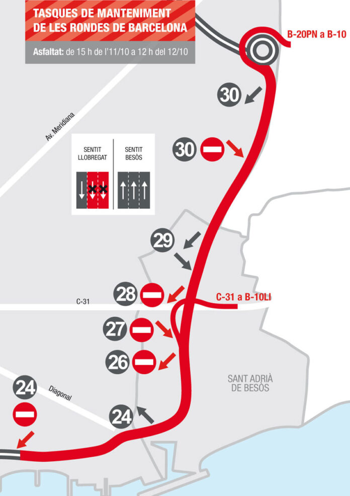 Les obres comportaran talls de circulació entre les 15.00 h del diumenge 11 d’octubre i les 12.00 h del dilluns 12, i la circulació quedarà restringida a un sol carril, sempre en sentit Llobregat. La circulació en sentit Besòs no quedarà afectada per aquestes obres. A més, quedaran totalment tallats els següents trams i incorporacions: