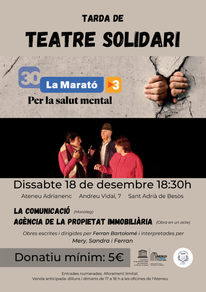 A l’acte es representaran el monòleg «La comunicació» i l’obra en un acte «Agència de la propietat immobiliària». Les dues obres estan escrites i dirigides per Ferran Bartolomé i interpretades per Mery, Sandra i Ferran.El donatiu mínim per poder gaudir de la tarda de teatre solidari és de 5 euros.