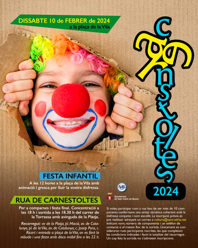 Aquest proper dissabte, 10 de febrer, Sant Adrià de Besòs celebra el Carnestoltes 2024 amb la tradicional festa infantil al matí i la rua a la tarda. Al matí, la plaça de la Vila acollirà a partir del migdia una festa amb animació i gresca pels més petits. A la tarda hi haurà la rua, amb la concentració dels participants a partir de les 18 hores, que començarà a les 18. 30 hores amb el següent recorregut: av de la Platja, pl. Macià, av. de Catalunya, pl. de la Vila, av. de Catalunya, c. Josep Pons, c. Ricart i entrada a pl. de la Vila, on es farà la rebuda i una festa amb disco mòbil fins a les 22h.