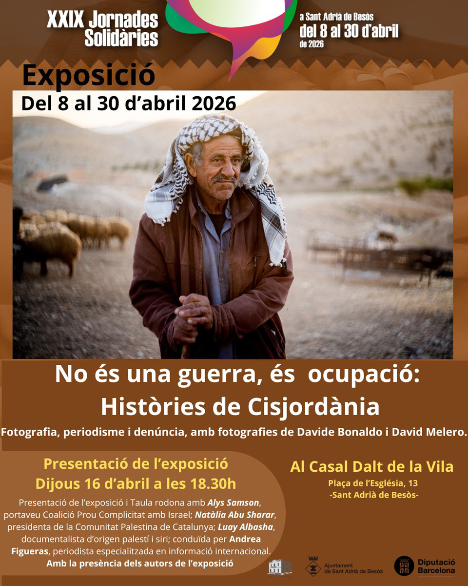 Des del passat 8 d’abril, dins de les XXIX Jornades Solidàries de Sant Adrià, es pot conèixer pràcticament de primera mà la realitat de Cisjordània gràcies a l’exposició fotogràfica «No és una guerra, és una ocupació: històries de Cisjordània», que es presentarà oficialment a la ciutat aquest dijous, 16 d’abril, a partir de les 18.30 hores. Per presentar-la es durà a terme una taula rodona amb Alys Samson, portaveu de Coalició Prou Complicitat amb Israel, Natàlia Abu Sharar, presidenta de la Comunitat Palestina de Catalunya, i Luay Albasha, documentalista d’origen palestí i siri. Serà conduïda per Andrea Figueras, periodista especialitzada en informació internacional. També hi seran presents els autors de l’exposició Davide Bonaldo i David Melero.